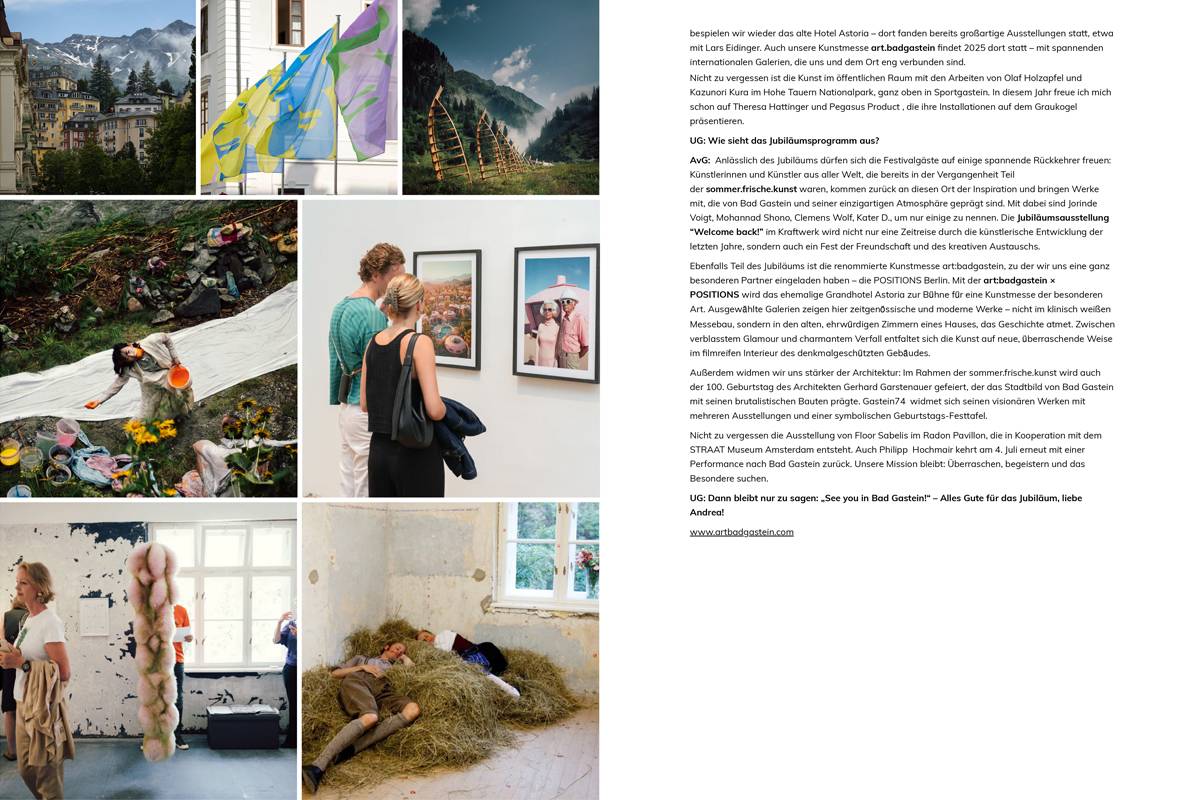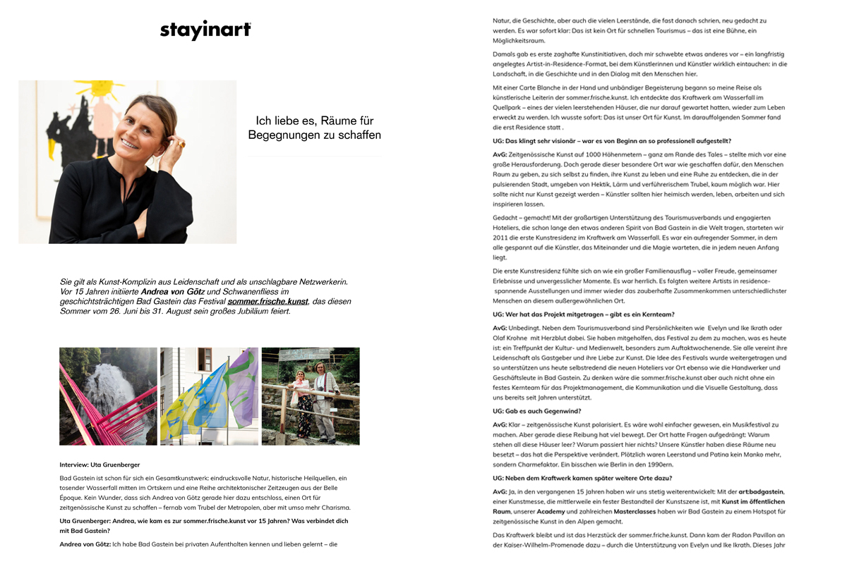 Für das hochwertigst aufgemachte Kunst-Sammlermagazin Stay in Art mein Online-Interview mit der Initiatorin und Kuratorin Andrea von Götz zu ihrem bemerkenswerten Jubiläum des angesagten Kunstfestivals in Bad Gastein. Von einer ersten Idee und spontanen Inspiration durch die Magie des Dorfs über diverse Hürden – hin zum international renommierten und in der Szene längst etablierten Art Events auf 1000 Meter Meereshöhe – vor einem einzigartigen Alpin-Panorama und im morbiden Charme des einst so mondänen Kurorts. Die preisgekrönte Kunst-Netzwerkerin eröffnet einen humorvollen Blick hinter die Kulissen.